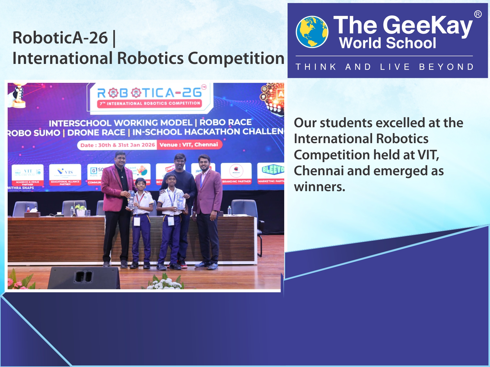 What can I say? The Geekay World School is without doubt the best school I have ever studied in. All the classes taken here are really interactive. The teachers help us understand any hard concept easily. Coming to sports, the school has a well-maintained football pitch, a basketball court, a tennis court and all the equipments needed to play. And the GC3 which is our Annual day celebration, is the grandest in town, with a big stage, a lot of bright lights, stalls among other things that brighten the event and of course we the students who give the event life. How can I not talk about the infrastructure when speaking about TGWS? The school has top class amenities with everything that a Number 1 day-cum boarding school in the whole state of Tamil Nadu needs.